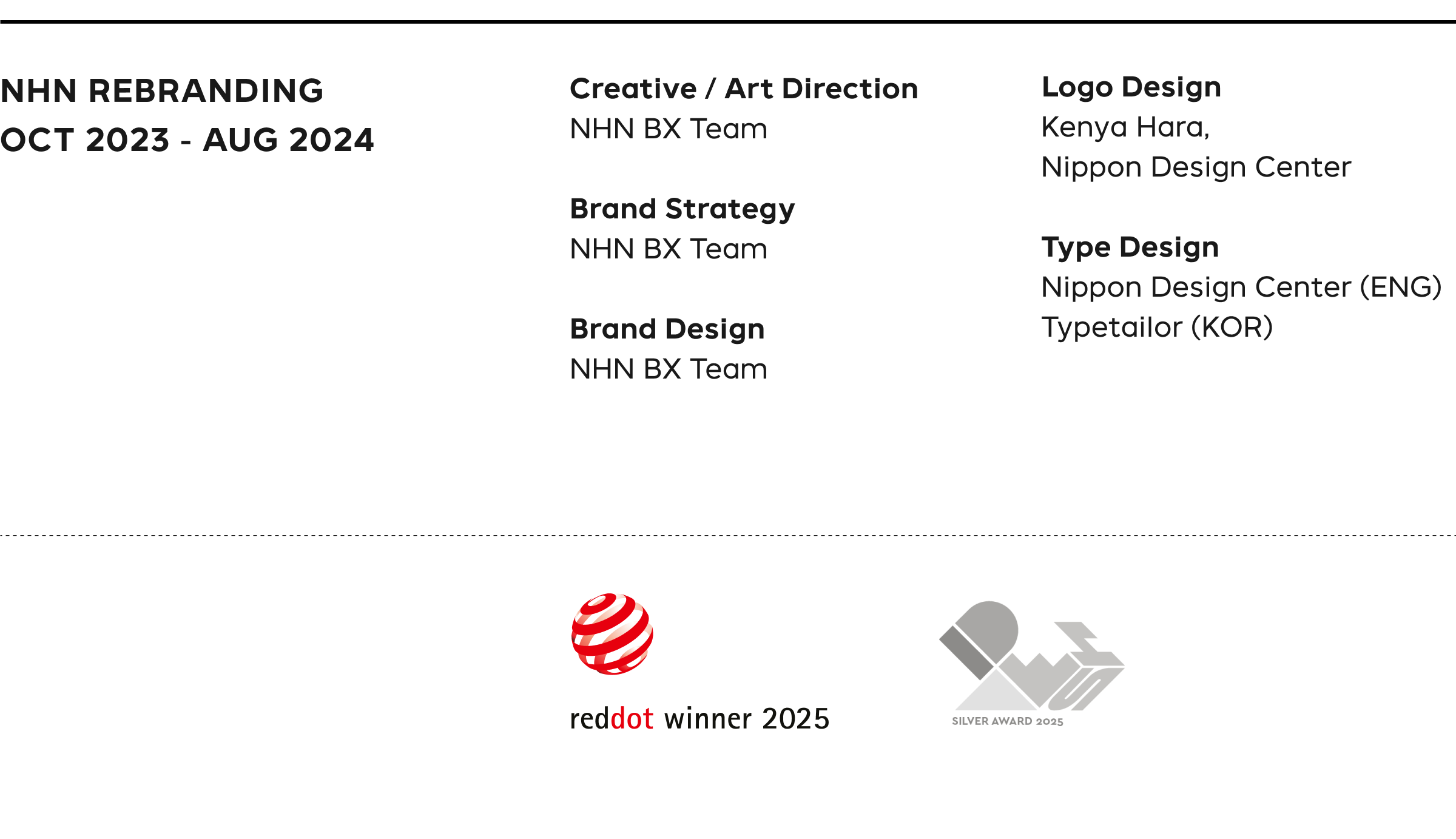 NHN 리브랜딩은 ‘Weaving New Play'라는 브랜드 슬로건을 기반으로, NHN의 다양한 사업 영역을 하나의 통합된 경험으로 연결한 프로젝트입니다. NHN이 지향하는 연결과 확장의 가치를 일관된 스토리와 디자인으로 담아냈다는 점에서 그 자체로도 충분히 의미 있는 작업이었어요. 거기에 더해 이번 어워드 수상은 NHN다움을 효과적으로 전달하기 위해 기울였던 치열한 고민과 완성도를 공식적으로 인정받았다는 점에서 더욱 의미가 큽니다.