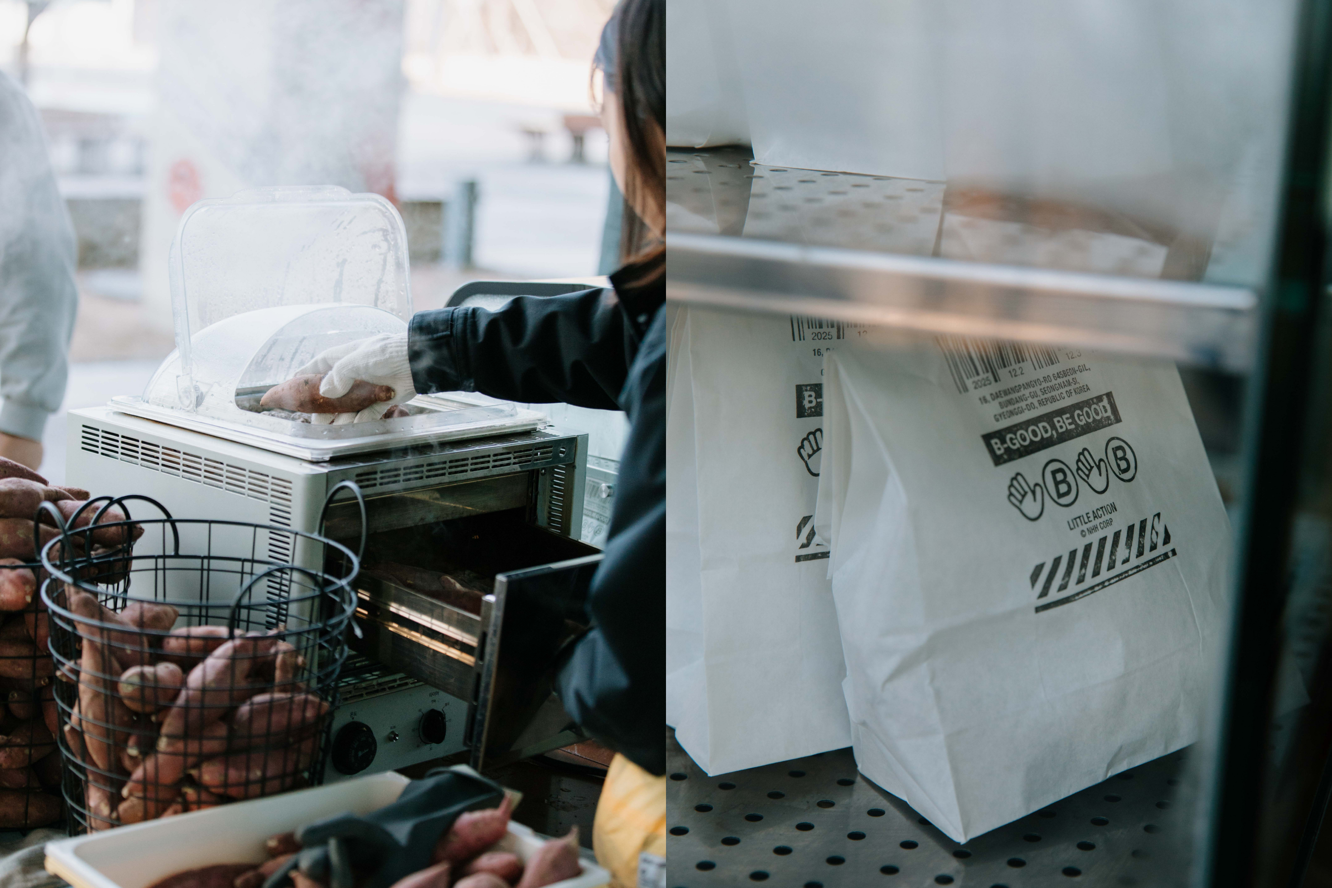 못생겨도 괜찮아! 정상품과 맛도 영양도 같지만, 단순히 못생겼다는 이유로 버려지는 농산물을 구출했습니다. 2023년에 이어 올해 또 한 번 못난이 채소 플랫폼 어글리어스와 협업해 무농약 감귤과 고구마를 준비했어요. 추운 겨울을 녹인 군고구마 냄새가 플리마켓의 재미를 한층 더하며 가장 붐비는 공간이 되었습니다.