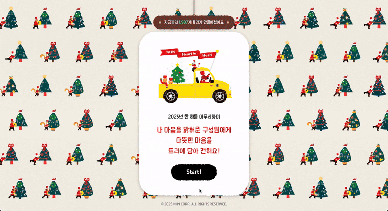 하트투하트 웹사이트는 사옥 외관을 장식한 동화 같은 분위기의 연말 윈도우그래픽 디자인을 활용했는데요. 트리 종류와 오너먼트 그리고 동물 친구를 순서대로 선택해 나만의 트리가 담긴 편지지를 만들 수 있었고, 이 편지지에 한 해 동안 고마웠던 구성원에게 마음을 적어 보낼 수 있도록 했습니다. 도움이 필요할 때 내밀었던 손길, 조언을 나누며 가졌던 잠깐의 티타임 시간, 인사에 답했던 밝은 미소는 2,000통의 따뜻한 편지가 되어 돌아왔습니다.