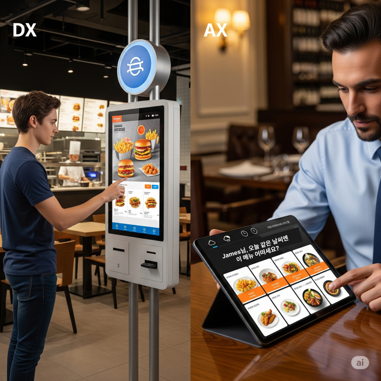 ▲DX: 손님이 식당에서 종업원에게 직접 주문하던 방식을 키오스크나 앱 주문으로 바꾸는 것