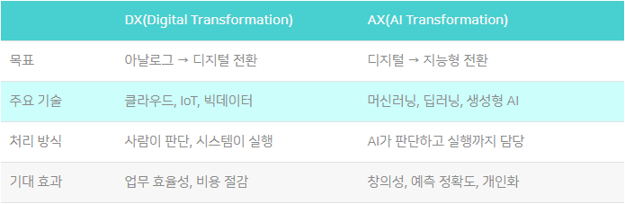 그리고 이제는 AI가 모든 산업을 흔들고 있어요. 챗GPT와 같은 생성형 AI가 DX를 넘어 새로운 전환기를 열고 있는 이 흐름을 'AI 전환', 즉 'AX(AI Transformation)'라고 부릅니다.